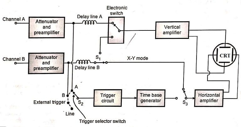 After amplification, both the channels are applied to an electron switch. This switch will connect one channel at a time to the vertical amplifier via a delay line.