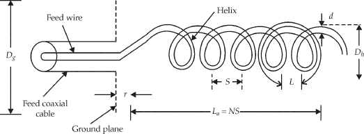 It consists of helical loops made of a thick conductor which have the appearance of a screw thread. It is associated with a ground plane made of the conductor. The ground plane is often made of screen or sheet or of radial and concentric conductors. This antenna is fed by a coaxial cable. This can be operated in normal and axial modes. The common antenna parameters are: